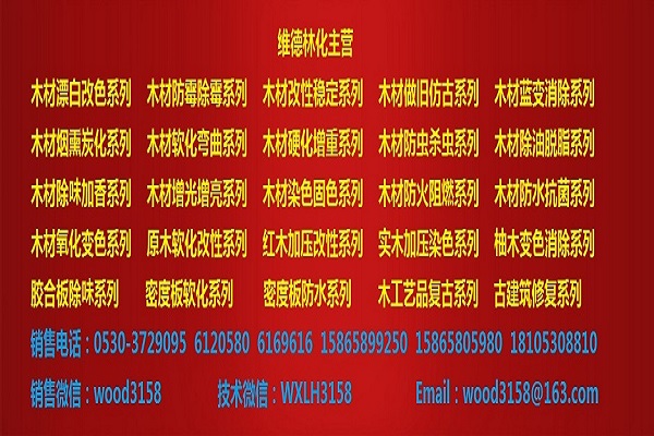 四:适用范围:VADINHUA木洁美-环保型木材活性改色剂系列产品主要用于流水线大批量产品改色变色效果操作(是目前取代化染产品的合适药剂),因不受单宁酸含量的影响,故可用于树种木材的改色处理。